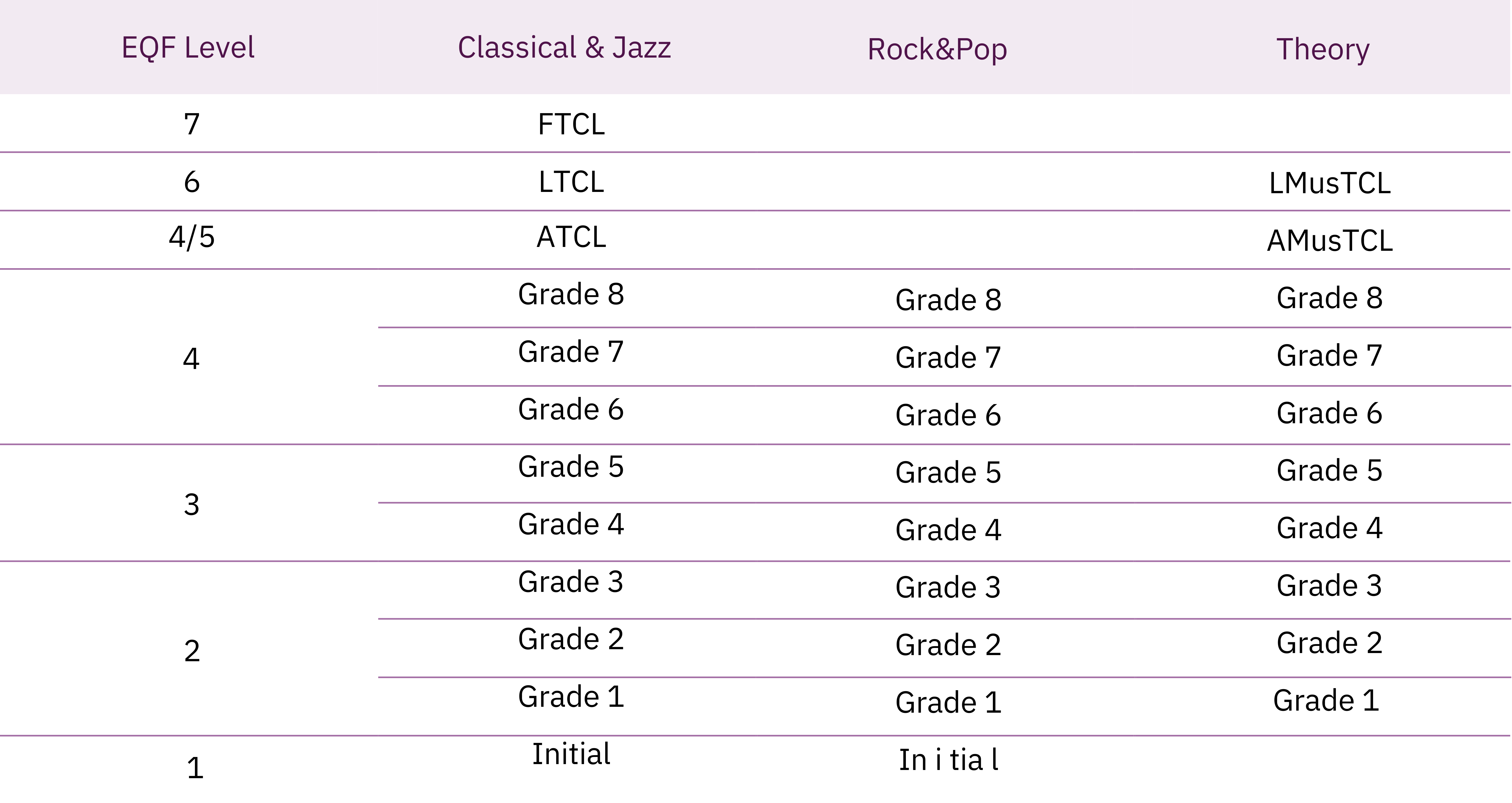 Trinity College London offre anche esami di Teoria Musicale, articolati in 8 livelli (Grade 1–8).